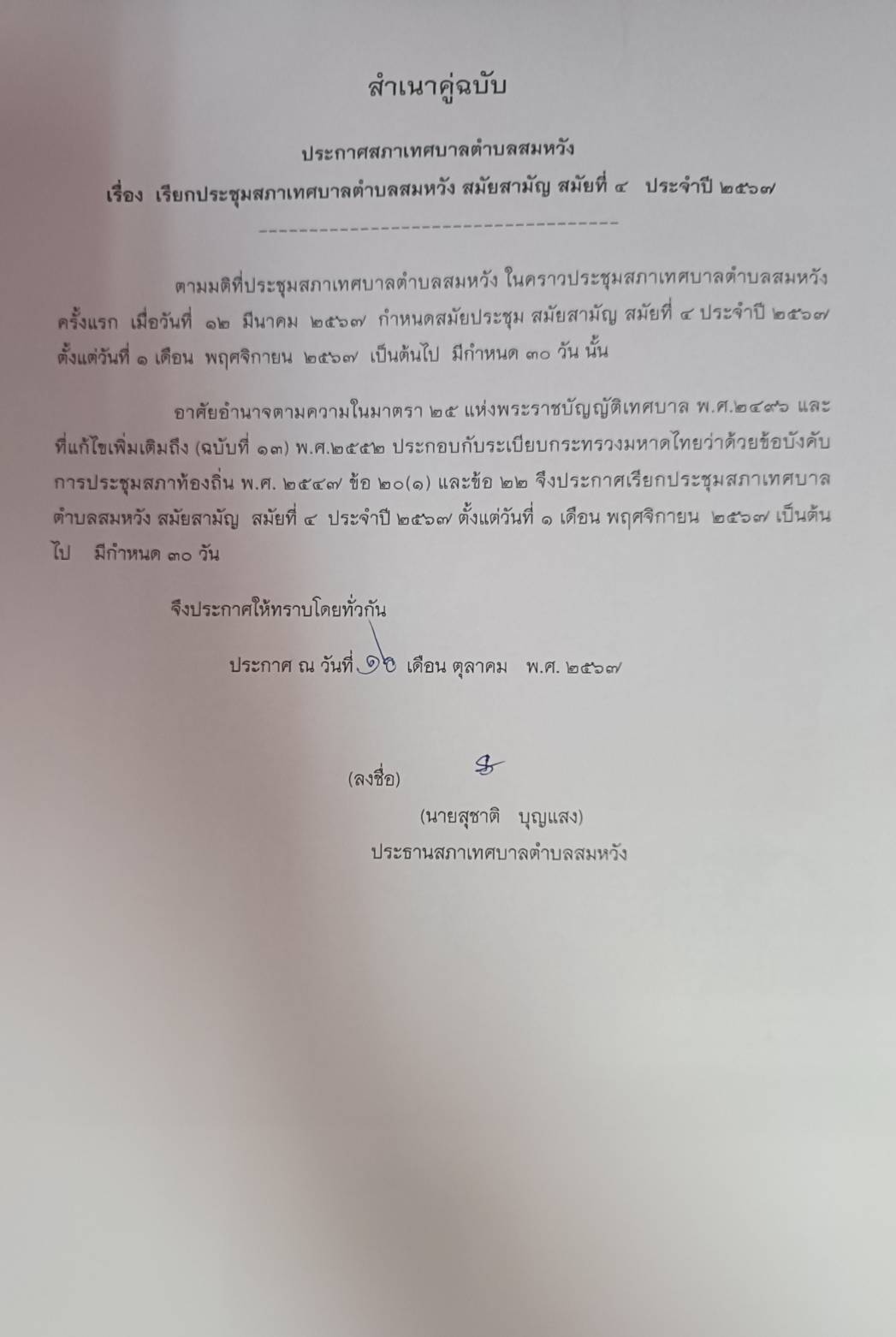 เรียกประชุมสภาสมัยสามัญ สมัยที่ 4 ประจำปี 2567