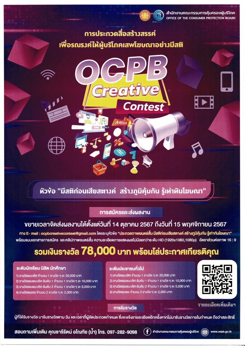 ประชาสัมพันธ์การประกวดสื่อสร้างสรรค์เพื่อรณรงค์ให้ผู้บริโภคเสพโฆษณาอย่างมีสติ ภายใต้งาน "OCPB Creative Contest" หัวข้อ "มีสติก่อนเสียสตางค์ สร้างภูมิคุ้มกัน รู้เท่ากันโฆษณา" [12 พฤศจิกายน 2567]